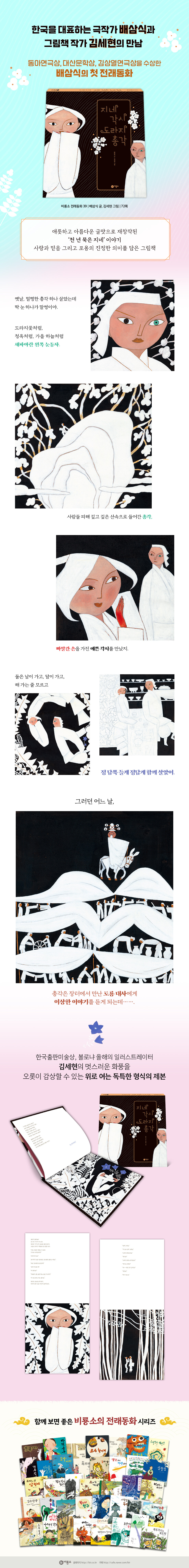 우리나라 대표 극작가 배삼식의 첫 전래동화 『지네 각시 도라지 총각』이 ㈜비룡소에서 출간되었다. 2023년 희곡 그림책 『훨훨 올라간다』 출간 후, 어린이를 위한 전래동화를 각색한 그림책은 처음이다. 대화하듯 입말로 흐르는 문체는 시공간을 넘어 책 속 인물과 마주하는 듯하다.