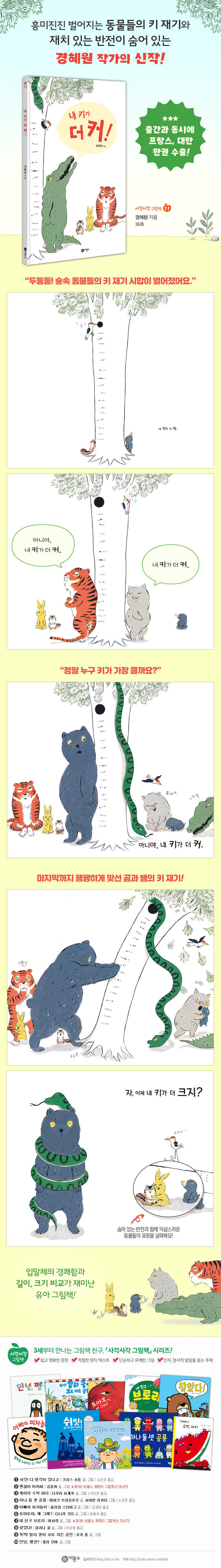 유아책의 기본 구성을 따르면서도 재치 있는 반전과 긴장감을 더하는 전개로 끝까지 독자의 시선을 끈다. 유아들 눈높이에 맞춘 길이, 크기 비교는 물론 아이들이 그림 속 녹아 있는 재미난 상황을 통해 마음껏 상상할 수 있도록 돕는다.