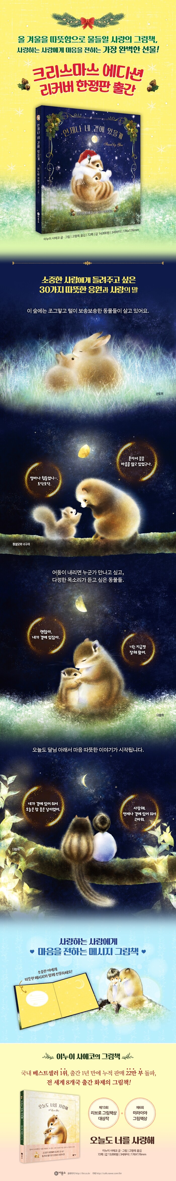 마음속에 담아 두어 늘 해 주고 싶은 말들이지만 결코 쉽게 할 수 없었던 말들을 담백하고도 따스하게 담아낸 그림책 『언제나 네 곁에 있을게』가 독자들의 사랑에 힘입어 크리스마스 기념 한정 리커버 에디션으로 ㈜비룡소에서 출간되었다.