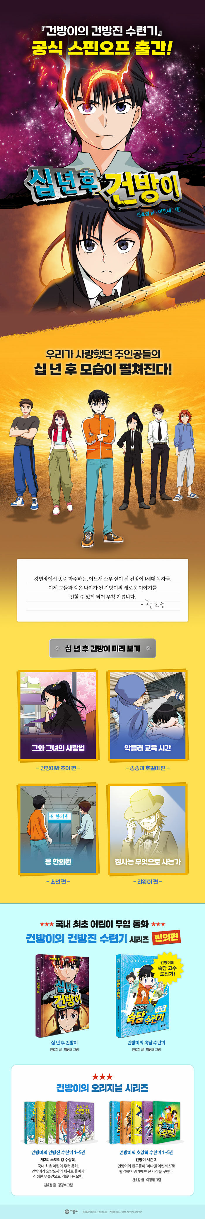 이번에 출간되는 공식 스핀오프 외전은 건방이 시리즈 완간을 아쉬워했던 독자들이 특히 궁금해하던 주인공들의 십 년 후 이야기를 본격적으로 그려낸다. 건방이와 주요 등장인물은 물론, 시리즈 속에서 깊은 인상을 남긴 조연들까지 다시 등장해 풍성하고 다채로운 후일담을 들려준다.