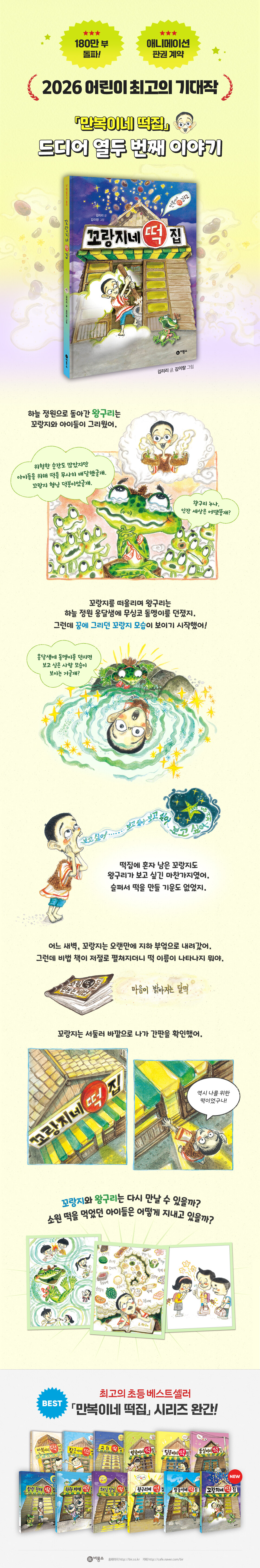 밀리언 셀러를 넘어 누적 판매 180만 부를 돌파하며 어린이책 분야 최고의 베스트셀러로 손꼽히는 「만복이네 떡집」 시리즈가 12권 『꼬랑지네 떡집』 출간으로 드디어 완간되었다. 「만복이네 떡집」은 제각기 결핍과 고민을 품은 아이들이 이야기마다 새로운 주인공으로 등장하며, 꼬랑지가 만들어 내는 세상에 하나밖에 없는 맞춤형 ‘소원 떡’을 통해 아이들의 웃음을 되찾아 주는 선한 판타지 동화다. 초등학교 국정 국어 교과서에 수록되면서 폭발적인 사랑을 받은 1권 『만복이네 떡집』을 시작으로, 16년간 이어진 어린이 독자들의 식지 않는 지지와 요청에 힘 입어 열두 편의 단단한 이야기 세계가 완성되었다. 김리리 작가는 시리즈가 이어지며 학교와 도서관 강연을 통해 현장에서 아이들의 적극적인 바람과 요청을 듣고 다음 이야기에 실제로 녹여내기도 했다. 작가와 독자가 함께 호흡하며 쌓아 올린 시간이라 더욱 뜻깊다.