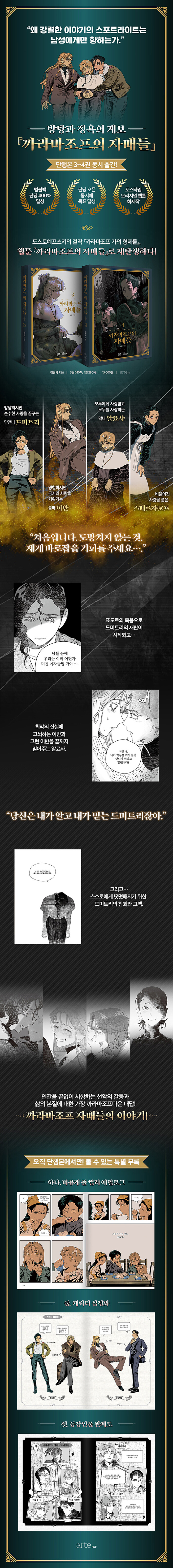 『까라마조프의 자매들』이 포스타입에서의 연재를 인기리에 종료하며, 완결 기념『까라마조프의 자매들』3~4권 출간으로 돌아왔다. 포스타입 오리지널 웹툰『까라마조프의 자매들』은 완결부에 이르러, 표도르 살해의 용의자로 체포된 드미트리의 재판이 진행된다.