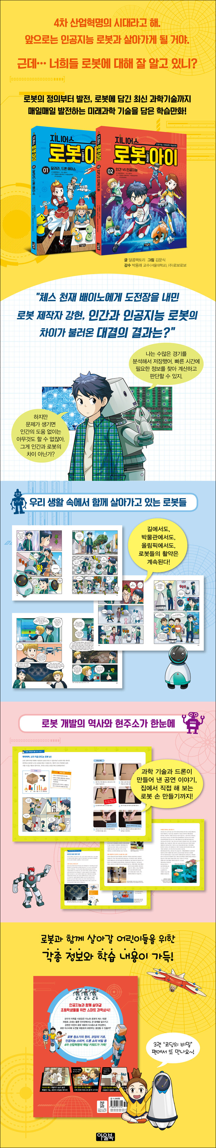 주인공과 친구들의 이야기를 통해 로봇과학에 대한 기초적인 지식을 자연스럽게 설명하는 학습만화이다. 눈앞에 펼쳐진 창의적인 과제에 대처하는 주인공의 이야기를 따라가다 보면, 자연스럽게 로봇과 인공지능에 대한 관심이 높아진다.