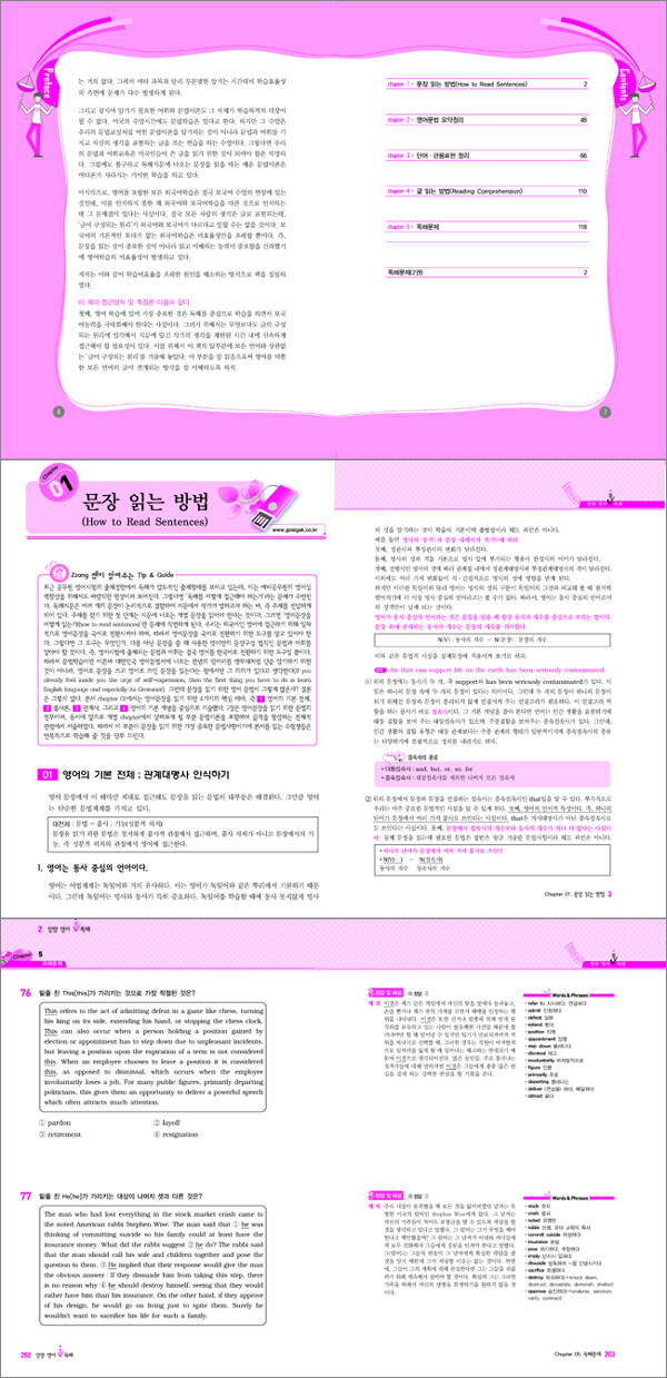 독해지문을 학습한 후, 반드시 전문번역을 읽으면서 국어적인 사고력을 길러줘야만 달라지는 독해지문을 접했을 때도 통일적인 해석을 할 수 있다. 문장번역에 가장 필요한 품사론을 4개의 테마로 구성했다. 문법이론을 숙지할 수 있도록 문법요약을 따로 책의 앞부분에 정리해 두었다.