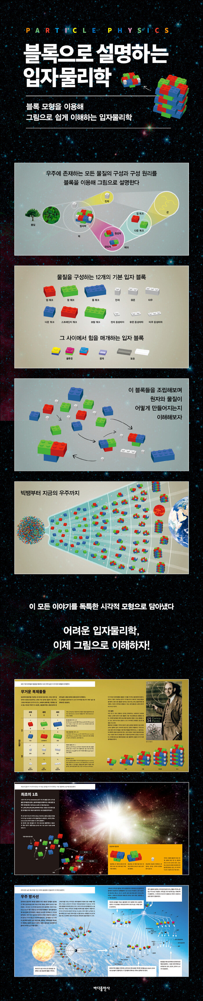 우주에 존재하는 모든 물질의 구성과 구성 원리를 이해하기 쉬운 블록을 이용해 그림으로 설명한다. 너무 어려워 도무지 이해하기 어려웠던 입자물리학의 세계. 직관적인 블록을 이용해 우주의 물질을 만들어보는 독특하고 흥미로운 탐험으로 이제 입자물리학의 세계를 이해하자.