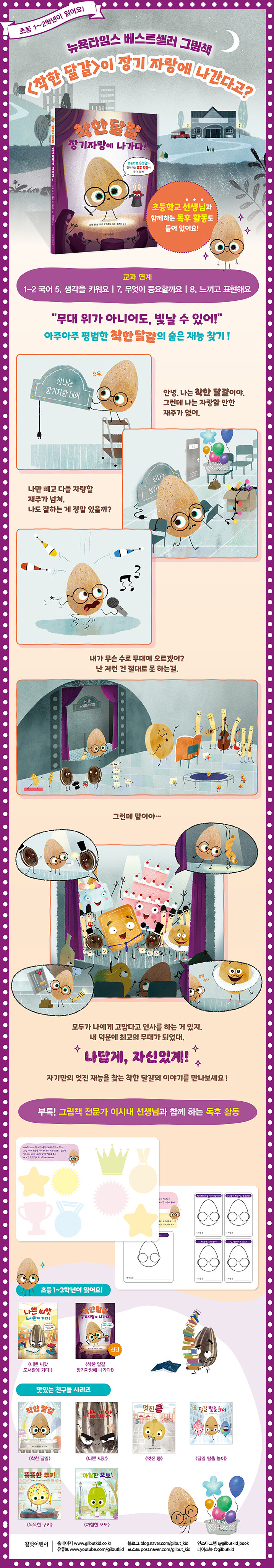 《착한 달걀 장기자랑에 가다!》는 ‘발표’와 ‘무대’라는 아이들이 실제 겪을 수 있는 상황을 배경으로, 재능과 용기, 그리고 친구를 돕는 마음을 담아냈어요. 아이들이 읽으면서 고개를 끄덕이며 공감할 수 있는 설정과 장면들이 이어져 읽는 내내 이야기 속으로 쏙 빠져들게 하지요.
