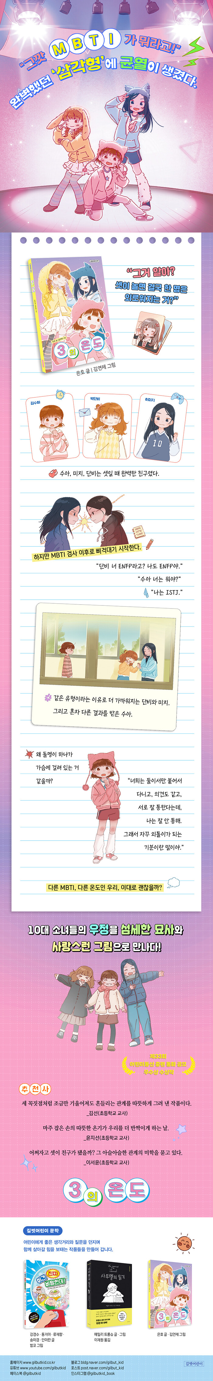 《3의 온도》는 제33회 어린이동산 중편 동화 공모 우수상 수상작으로, 중편 작품을 장편으로 확장하며 새롭게 글을 다듬고, 김연제 작가의 사랑스런 그림을 덧붙인 작품이다. 여자아이들 사이에서 오가는 미묘한 감정과 관계의 결을 섬세하게 포착했다. 요즘 아이들이 실제로 경험하는 고민들을 익숙한 MBTI라는 소재를 통해 ‘다름을 이해하는 과정’으로 자연스럽게 녹였다. 성격 유형 검사는 사람을 나누기 위한 기준이 아니라 서로를 이해하기 위한 출발점이다. 작품 속 수아 역시 친구들과 다른 결과를 받아 들며 외로움을 느끼지만, 결국 서로의 차이를 인정할 때 관계가 더욱 깊어진다는 사실을 깨닫는다.