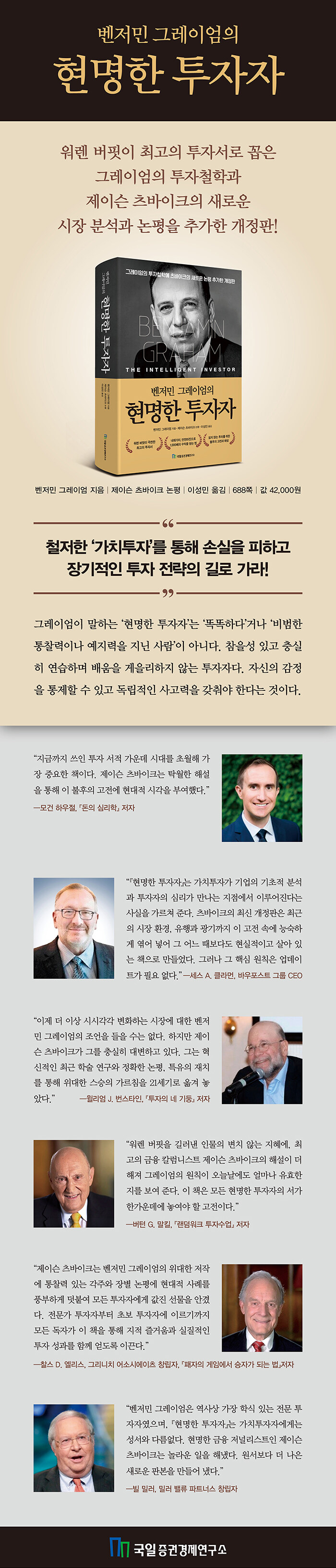 그레이엄은 이 간결한 문장으로 투자의 본질을 꿰뚫는다. 이 책이 전하고자 하는 핵심 메시지는 투자가 당신이 지금까지 믿어온 것과는 완전 딴판이라는 사실이다.