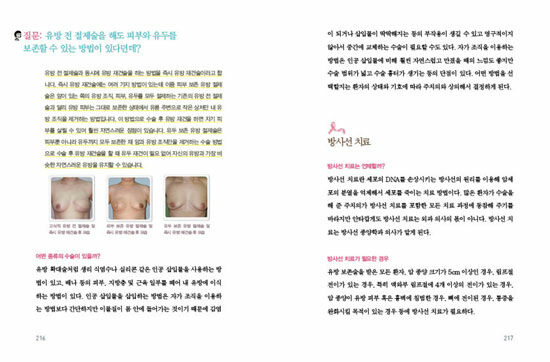유방암 자가 진단법에서부터 유방암 치료, 유방 복원, 수술 후 부작용과 그 예방법까지 유방암과 관련된 모든 정보를 공개한다. 유방암은 우리나라 여성 25명당 1명꼴로 발생할 만큼 발생률이 높지만 다른 암과 달리 자가 진단이 가능한 병으로 검진, 진단법을 제대로 알면 충분히 유방암을 예방할 수 있다. 유방암을 치료 중인 여성에게는 100% 완치를 위한 알짜배기 정보도 수록했다.