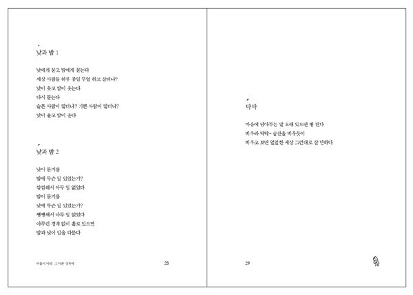 머물지 마라 ● 상처 ● 고통의 소멸 ● 만약 ● 성인군자도 ● 살아 있는 모든 것 ● 존재의 슬픔 ● 그리움 ● 고독한 이단자 ● 기도 ● 무슨 일로 ● 골짜기 ● 낮과 밤 1 ● 낮과 밤 2 ● 탁탁 ● 비 ● 안녕 ● 오늘 밤엔 ● 산유화 ● 외로운 영혼 ● 비명 ● 산짐승 ● 鳴 ● 기적 ● 그리운 사람 ● 슬픔을 알아야 ● 구석진 자리 ● 홀로 우는 새 ● 그대여 ● 지금 당장 ● 물 ● 새벽 ● 감자 ● 진실한 사랑 ● 아까운 마음 ● 사람만이 사람을 ● 안개비 ● 사람아 사람아! ● 모든 것을 잃어도 ● 희망의 빛 ● 놓고 놀면 ● 알약 ● 깃 ● 반드시 ● 얼음꽃 ● 회상 ● 사람인 까닭 ● 고목 ● 새