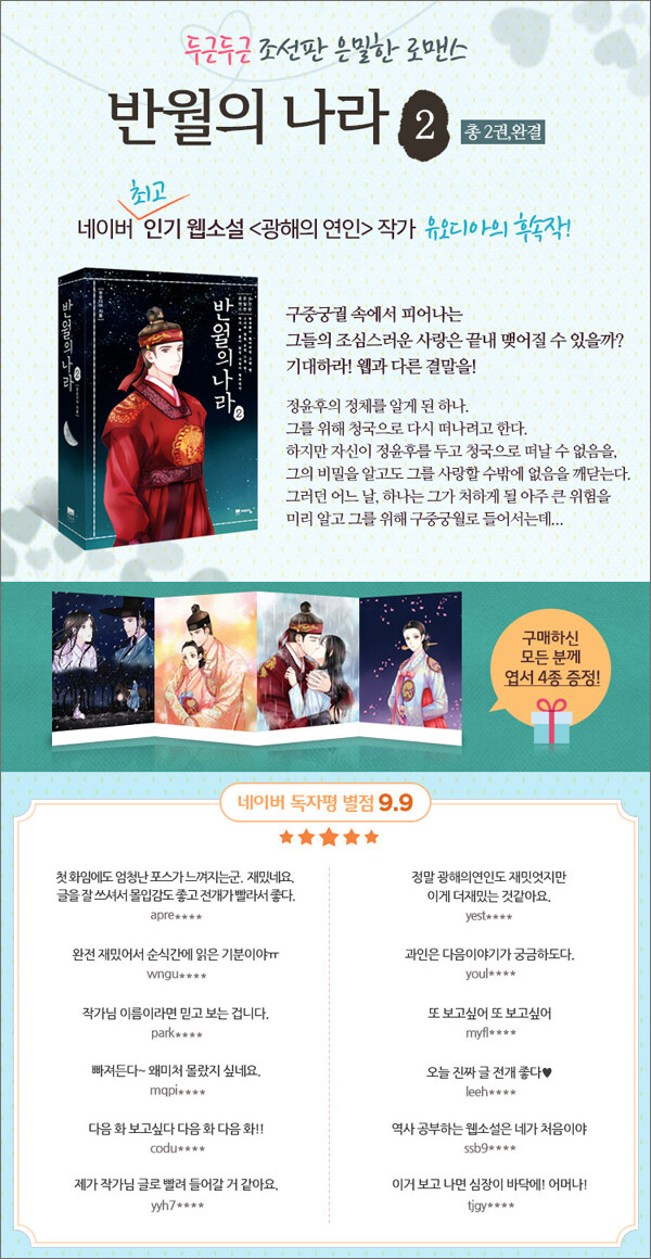 유오디아의 로맨스 소설. 조선시대 왕들 중 가장 인지도가 낮은 왕 '헌종'을 주인공을 내세운 이번 이야기는 헌종과 관련된 민담과 야사, 정사 등 다양한 자료들을 모티브로 삼아 신비로운 사랑 이야기를 구성했다.