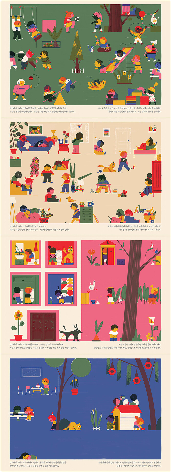 너, 나, 그들로 지칭되는 각각이 어떻게 ‘우리 모두’로 이어지는지를 보여주는 그림책이다. 한 장 한 장 페이지를 넘길 때마다 우리가 가진 문화적 차이와 경계는 무너지고, 우리를 연결해주는 요소들이 쌓여간다.