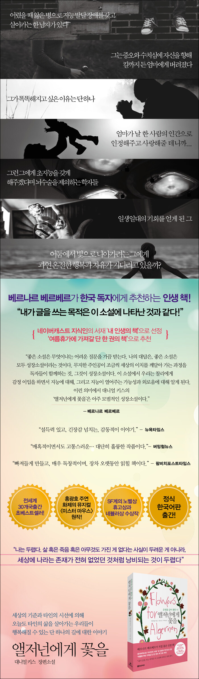이젠 불가능하다. 아이큐가 70이었을 때만큼 아이큐가 185인 지금도 나는 키니언 선생님에게서 멀리 떨어져 있다. 이번에는 두 사람 다 그것을 알고 있다.