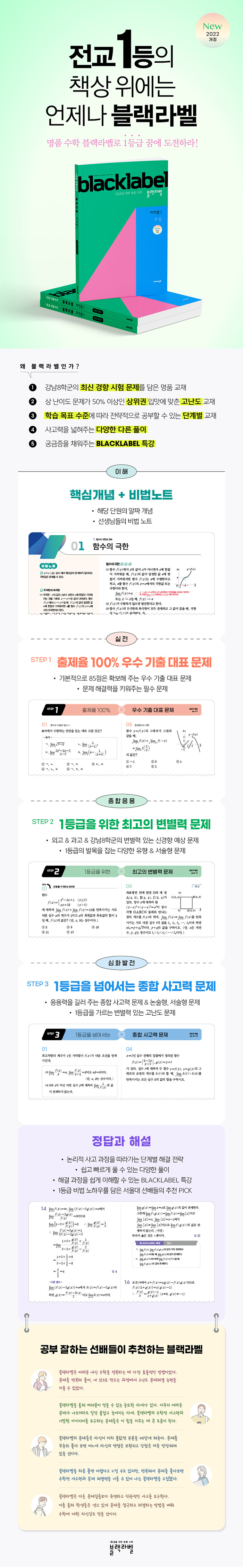 블랙라벨은 입체적인 해설을 제공합니다. 명쾌한 해설과 함께 단계별 해결 전략을 통해 문제 풀이의 흐름을 쉽게 이해할 수 있도록 하였으며, 다양한 풀이 방법과 차별화된 특강, 그리고 선배들의 노하우도 함께 제시되어, 학생들에게 문제 해결의 다양한 시각을 길러줍니다.