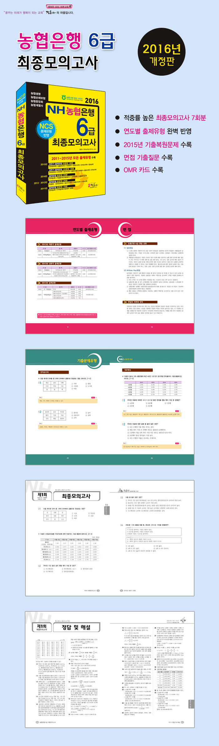 · 제목 : 2016 NH농협은행 6급 최종모의고사 (NCS 문제유형 반영, 연도별 출제유형 반영, 2015년 기출문제 수록, 면접 질문 기출수록, 최종모의고사 7회분 수록)