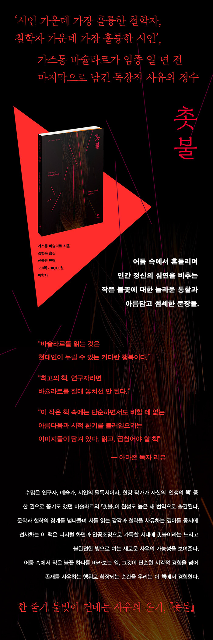 과학철학과 상상력 연구에 일생을 바친 프랑스 철학자 가스통 바슐라르가 임종 일 년 전에 출간한 마지막 저술로, 촛불이 우리에게 불러일으키는 시적 몽상을 탐구한 철학적·문학적 에세이다.