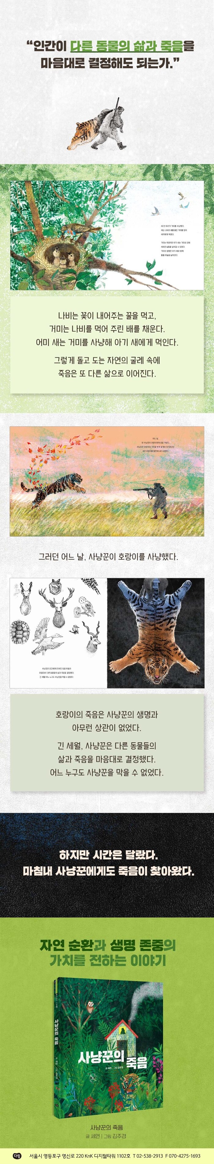 어느 날, 사냥꾼이 호랑이를 사냥했다. 사냥꾼은 호랑이의 가죽을 벗겨 깔개로 쓰고는 죽은 호랑이를 들판에 버렸다. 호랑이의 죽음은 사냥꾼의 생명과 아무런 상관이 없었다. 긴 세월, 사냥꾼은 다른 생명의 삶과 죽음을 마음대로 결정했다. 마침내 시간이 흘러 사냥꾼에게도 죽음이 찾아왔다.
