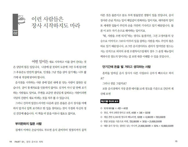 음식 장사는 하루 아침에 승부를 보는 것이 아닙니다. 내가 일관된 맛과 서비스를 얼마나 오랫동안 손님에게 제공할 수 있느냐, 또 그 기간 동안 수익을 유지하며 어떻게 버티어 내느냐가 성공으로 가는 열쇠입니다.
