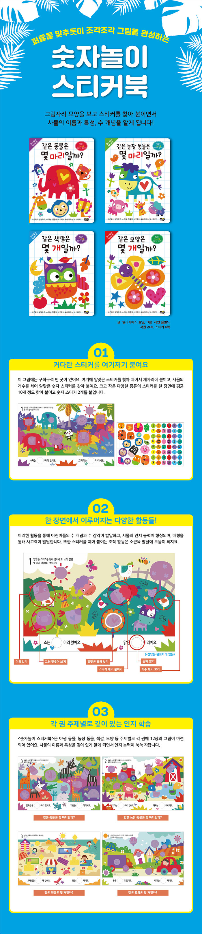 숫자놀이 스티커북 시리즈. 얼룩말, 기린, 고릴라, 나무늘보 등 야생에서 생활하는 동물 그림이 가득 그려진 바탕에는 구석구석 빈 곳이 있다. 여기에 알맞은 스티커를 찾아 제자리에 붙여서 그림을 완성한다. 알맞은 스티커를 붙이며 야생 동물을 배울 수 있다.