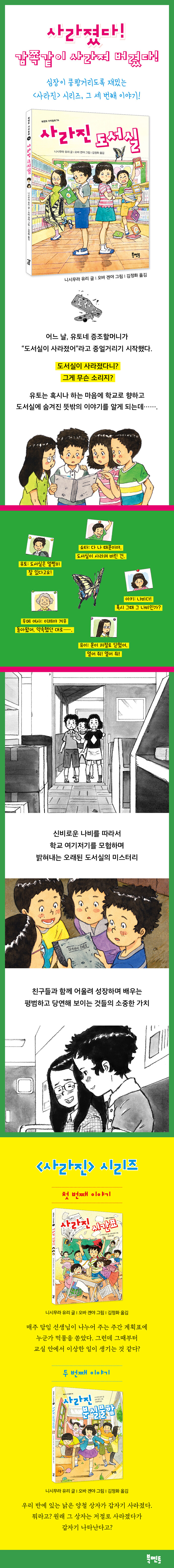 수상함을 넘어 불가사의한 새로운 미스터리 동화 <사라진> 시리즈 그 세 번째 이야기가 출간됐다. 어느 날 학교에 방문한 뒤로, 유토네 증조할머니는 이상한 말을 중얼거리기 시작한다. 도서실이 사라졌어라고……. 유토는 멀쩡히 잘 있는 학교 도서실을 왜 사라졌다고 말하는 건지 의문스러워서 주변 친구들에게 이야기하고, 친구들로부터 그동안 몰랐던 이야기들을 듣게 된다.