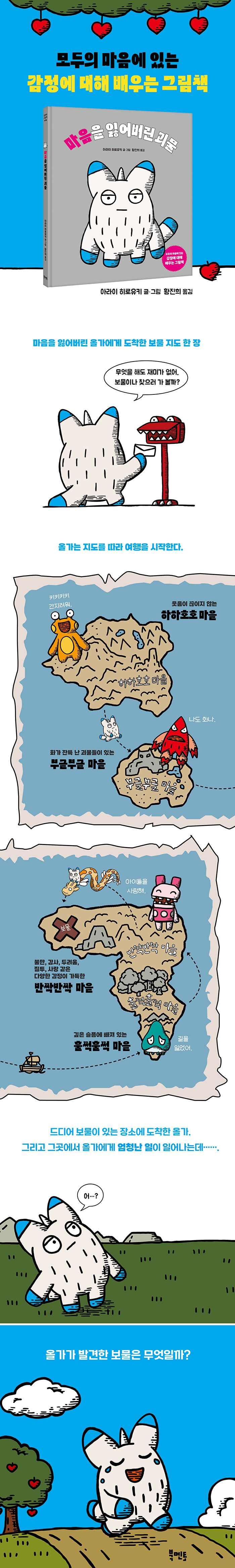이 작품의 가장 큰 매력은 감정을 하나의 세계로 펼쳐 보여 준다는 점이에요. 이유 없이 웃음이 넘치는 하하호호 마을, 사소한 일에도 화가 끓어오르는 부글부글 마을, 슬픔이 가득 내려앉은 훌쩍훌쩍 마을, 그리고 설렘과 질투, 사랑과 감동이 함께 반짝이는 반짝반짝 마을까지?각기 다른 마을은 감정의 다양한 얼굴을 생생하게 드러내지요. 아이들은 올가와 함께 이 마을들을 지나며 감정을 직접 경험하듯 느끼고, 그 마음이 왜 생기는지 스스로 생각해 보게 되어요. 감정을 옳고 그름으로 나누기보다, 있는 그대로 이해하고 받아들이는 태도를 자연스럽게 배우게 되는 것이지요. 마음은 때로 우리를 힘들게 하지만, 그 마음이 있기에 우리는 서로를 이해하고 세상과 연결될 수 있다는 것. 《마음을 잃어버린 괴물》은 아이들이 자신의 감정을 소중히 여기고, 타인과 마음을 나누는 기쁨을 배워 가도록 돕는 따뜻한 그림책이에요.