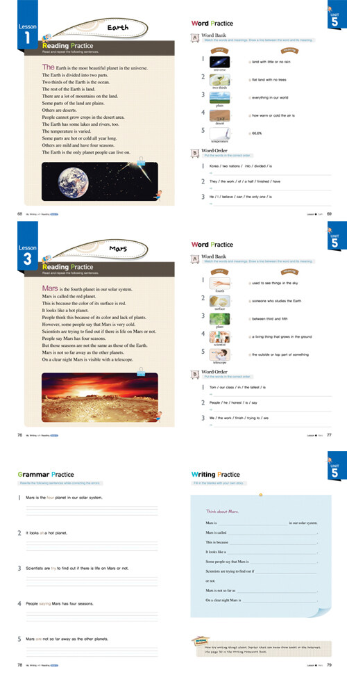 시사 또는 일반 상식을 더하기 위한 Reading part 와 문법 및 언어구성을 이해하도록 하는 Word practice & Grammar practice part, 그리고 학생들의 영어에세이를 훈련하도록 하는 Writing practice part로 구성되어 있다.