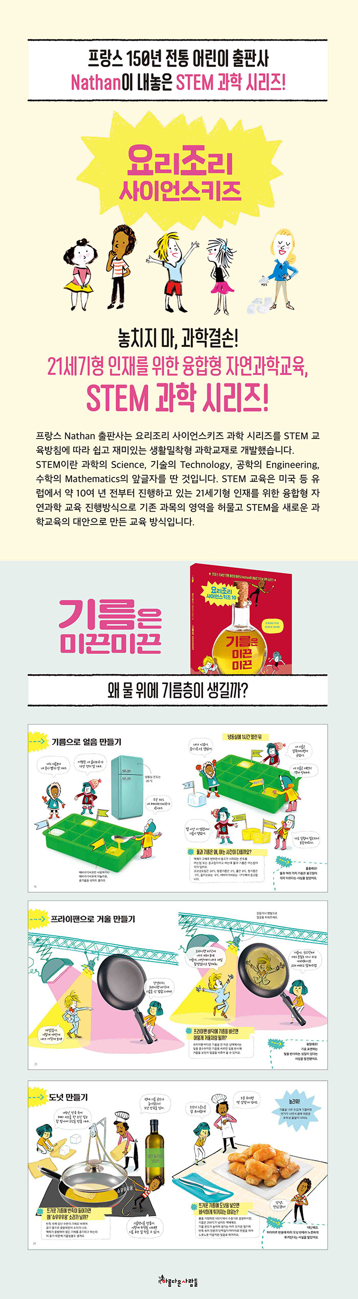 기름이 어떤 특성을 가졌는지 살펴보고 어떤 식물에서 기름을 짜내는지도 함께 알아본다. 기름은 물보다 가벼운지 무거운지에 관한 실험도 한다. 실험을 해 보면 무슨 이유로 기름이 항상 물 위에 뜨는지 그 원리는 뭔지, 밀도에 관해 이해한다.