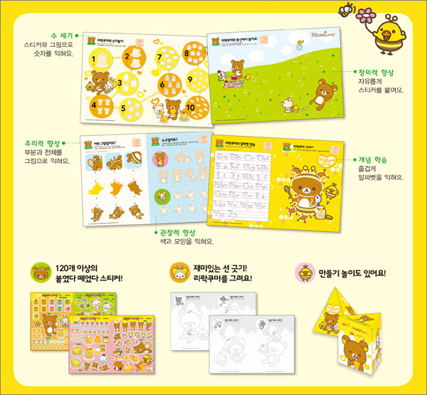 120개 이상의 붙였다 떼었다 리락쿠마 스티커가 들어 있는 두뇌계발 놀이 워크북이다. 손가락을 활발히 움직이며 뇌를 발달시키는 유아기에 손과 눈의 협응력, 집중력을 기르는 데 도움을 주는 유익한 스티커 놀이북이다. 숫자와 한글을 익히는 간단한 학습을 스티커 놀이로 즐길 수 있다.