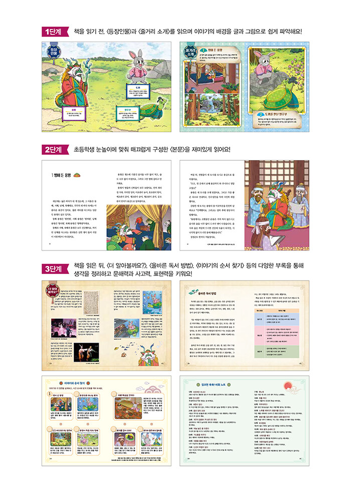 * 3단계: 책을 읽은 뒤, <더 알아볼까요?>, <올바른 독서 방법>, <이야기의 순서 찾기> 등의 다양한 부록을통해 생각을 정리하고 문해력과 사고력, 표현력을 키워요!