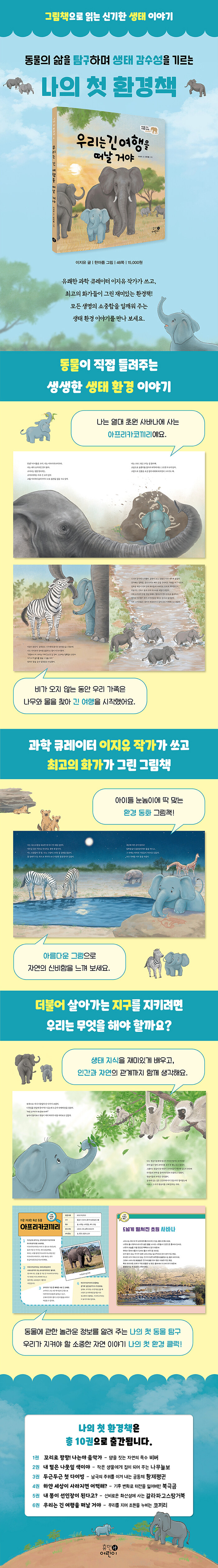 동물의 삶을 따라가며 공존의 가치를 배우는 생태 환경 그림책 시리즈다. 6권 《우리는 긴 여행을 떠날 거야》에서는 사바나의 아프리카코끼리 코리 가족의 여정을 따라 물과 나무를 찾아 이동하는 삶을 그리며, 이야기 뒤에는 동물 탐구와 환경 정보를 더해 이해를 넓힌다.