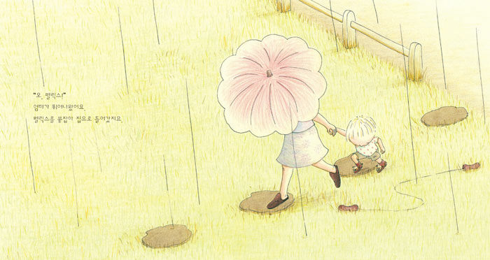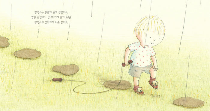 그래서 슬리퍼를 신은 채 물을 잔뜩 머금은 잔디밭으로 뛰어나갔어요.