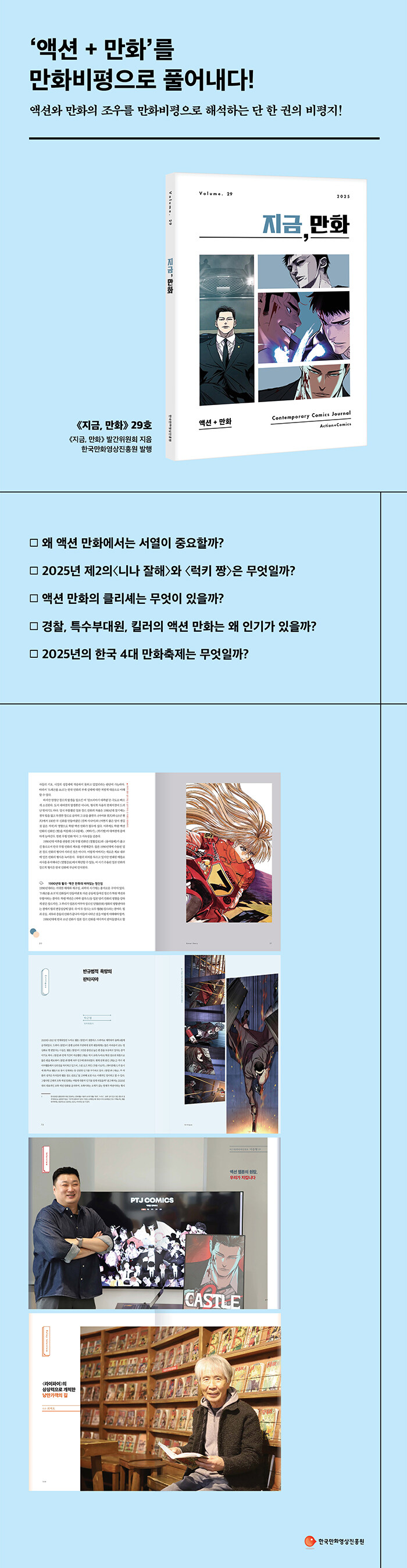 만화웹툰 비평지《지금, 만화》29호의 ‘커버스토리’는 액션 장르 만화와 웹툰의 형성과 개념을 짚어보면서 액션 장르가 가지는 시대정신이 무엇이며 특징과 클리셰를 알아본다. 1990년대 학원 액션 만화가 2026년에는 어떻게 바뀌었는지 다양한 측면에서 분석했다. ‘크리틱’에서는 액션 장르 만화의 특징, 학원 액션 만화의 세계관이 어떻게 변화했으며 액션 장르 만화에서 자주 등장하는 직업과 스토리가 어떻게 영향을 미치는지 비평했다.