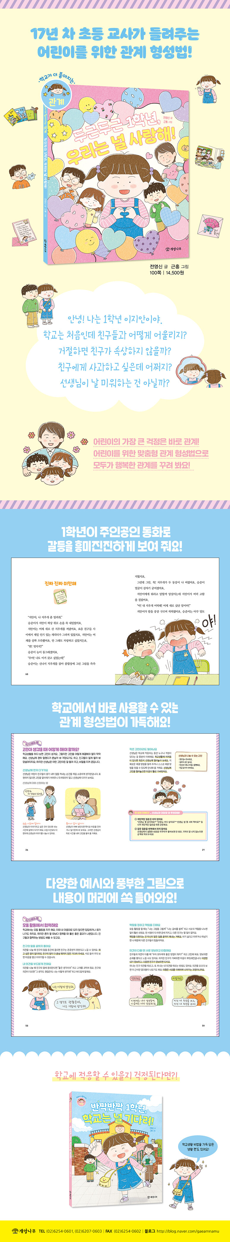 《두근두근 1학년, 우리는 널 사랑해!》는 선생님, 친구와 관계 맺는 법이 고민인 어린이를 위한 책입니다. 학교 가는 길, 어린이의 발걸음을 무겁게 하는 진짜 고민은 바로 ‘관계’입니다. 선생님이 날 미워할까 봐, 친구들과 어울리지 못할까 봐 걱정하지요. 이 책은 1학년 친구들이 겪는 갈등을 다룬 동화와 관계 형성법을 알려 주는 정보 페이지로 구성했습니다. 이 책을 통해 선생님, 친구와 마음을 나누며 단단한 관계 만드는 법을 배우고, 사랑이 넘치는 학교생활을 할 수 있기를 바랍니다.