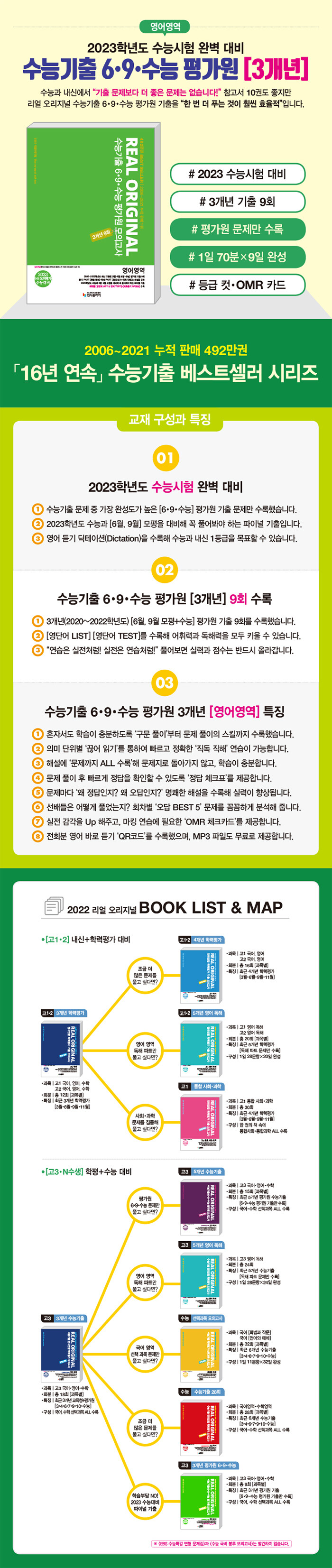 · 제목 : 리얼 오리지널 수능기출 6.9.수능 평가원 모의고사 3개년 9회 영어영역 (2022년) (2023 수능대비)