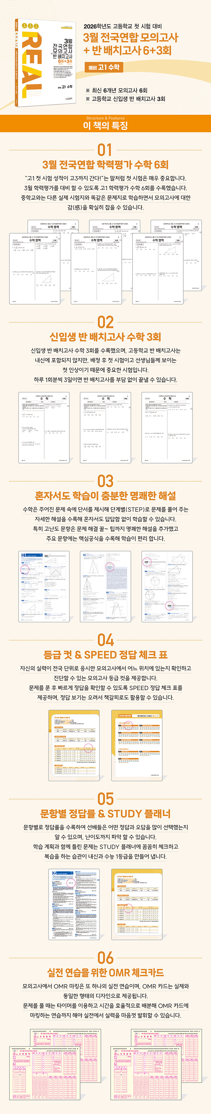 고등학교 첫 시험 고1 3월 『전국연합 학력평가』와 『반 배치고사』를 동시에 대비할 수 있다. 3월 시행되는 전국연합 학력평가를 대비해 고1 3월 『수학 영역』 기출문제 6회분을 수록했으며, 2월 시행되는 고등학교 신입생 반 배치고사를 대비해 『수학 영역』 기출문제 3회분을 수록했다.