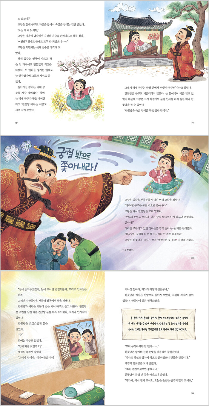 즐거운 동화 여행 155권. 고왕의 셋째 공주인 한꽃당은 첫째와 둘째 공주가 아버지의 은혜로 살아간다고 말한 반면, 자신은 주어진 운명대로 살아간다고 말하는 바람에 왕의 노여움을 사서 쫓겨나게 되는데….