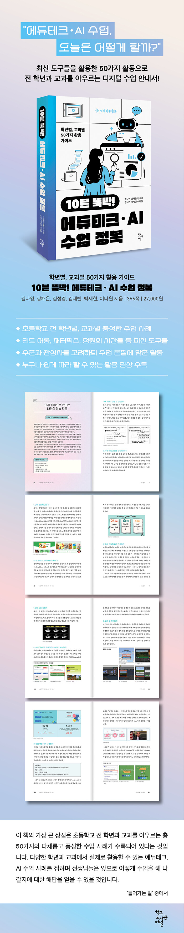 이 책의 가장 큰 장점은 초등학교 전 학년과 교과를 아우르는 총 50가지의 다채롭고 풍성한 수업 사례가 수록되어 있다는 것입니다. 다양한 학년과 교과에서 실제로 활용할 수 있는 에듀테크, AI 수업 사례를 접하며 선생님들은 앞으로 어떻게 수업을 해 나갈지에 대한 해답을 얻을 수 있을 것입니다.