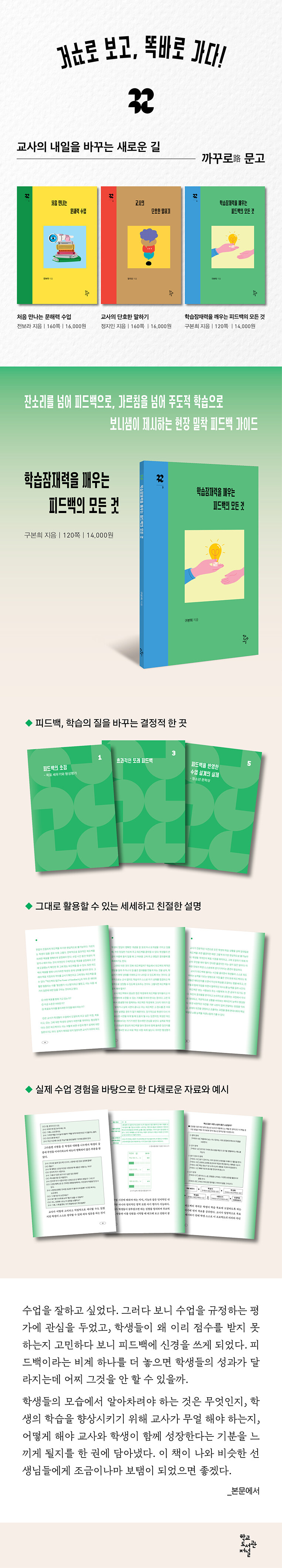 피드백이 바뀌면 학생이 움직이고, 학생이 움직이면 수업이 살아난다. 책 속에는 배움의 밀도를 높이는 단계별 피드백 가이드가 담겨 있다.