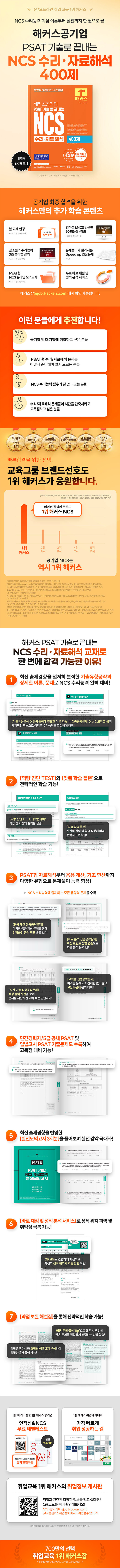 · 제목 : 해커스공기업 PSAT 기출로 끝내는 NCS 수리·자료해석 400제 (한국철도공사(코레일)·한국전력공사·국민건강보험공단·서울교통공사·한국보훈복지의료공단·건강보험심사평가원·한국수자원공사·국민연금공단·한국토지주택공사·한국도로공사·한전KPS·한국수력원자력·한국국토정보공사·한국농어촌공사·한전KDN·인천국제공항공사·근로복지공단·한국산업인력공단·한)