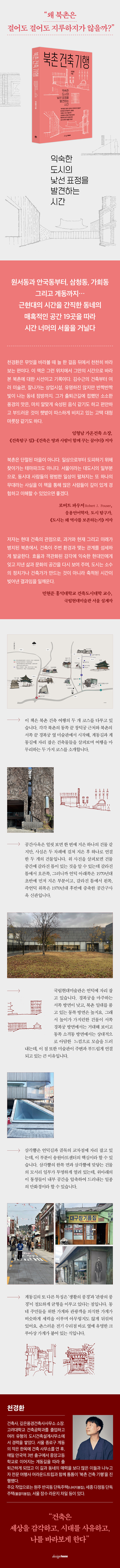 북촌 한편에서 조그맣게 둥지를 틀고 출퇴근하던 저자는 몇 달이 지나도 매일 다니는 길이 왜 지루해지지 않는지, 그 길 위에서 어떤 사람들이 살아가는지, 주변 동네에는 어떤 건물이 늘어서 있는지를 궁리한다. 또한 한옥에 사무실을 마련하면서 그간 한옥에 갖고 있던 편견도 깨트리고 한옥의 매력도 새롭게 발견한다. 이런 과정을 거쳐 저자가 알아보고 깨달은 것들은 건축 여행 전문사에서 일종의 건축 도슨트로서 일하면서 다듬어져 ≪북촌 건축 기행≫에 담겼다.