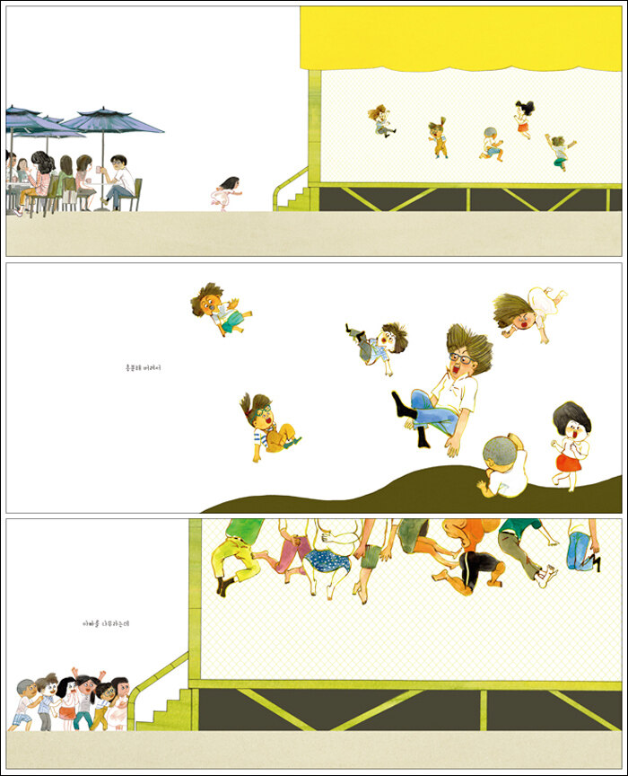 방방이 위에서 신나게 놀던 하람이는 아빠를 부른다. 잠시 망설이던 아빠는 어느새 방방이 재미에 푹 빠진다. 방방이 위에서 마구 뛰어 오르는 아빠 때문에 아이들은 모두 놀라 도망간다. 리듬감 있는 재미있는 글과 유머러스한 그림으로 유쾌한 기분을 전하는 그림책이다.