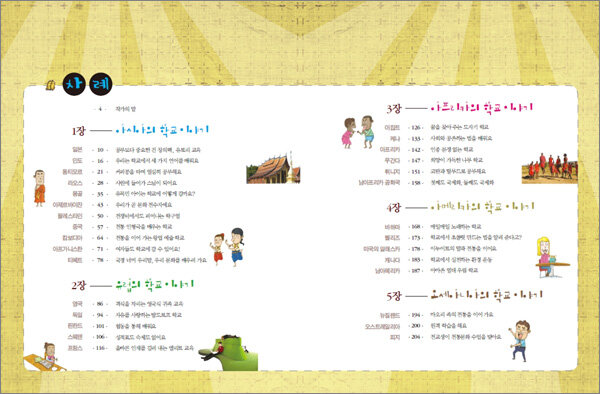 일본_공부보다 중요한 건 창의력, 유토리 교육 | 인도_우리는 학교에서 세 가지 언어를 배워요 | 동티모르_커피콩을 따며 열심히 공부해요 | 라오스_사원에 들어가 스님이 되어요 | 몽골_유목민 아이는 학교에 어떻게 갈까요 아제르바이잔_우리가 곧 문화 전수자예요 | 팔레스타인_전쟁터에서도 피어나는 학구열 | 중국_전통 인형극을 배우는 학교 | 캄보디아_전통을 이어 가는 왕립 예술 학교 | 아프가니스탄_여자들도 학교에 갈 수 있어요! | 티베트_국경 너머 우리말, 우리 문화를 배우러 가요