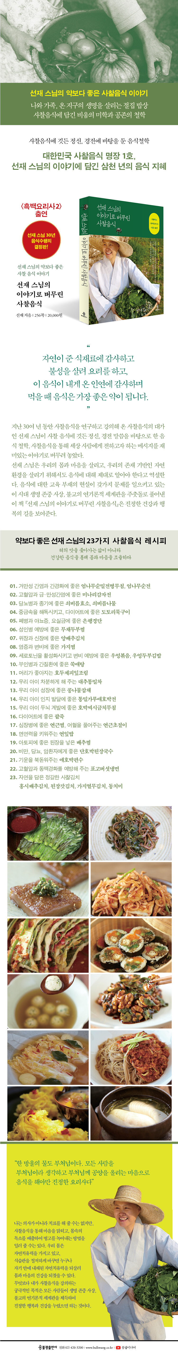 국민 의사로 불리는 이시형 박사의 추천사에서도 엿볼 수 있듯 이 책은 단순한 사찰음식 책이 아니다. 삶의 가치관을 근본적으로 변화시키고 건강과 행복의 근원을 일깨워 주는 책이다.