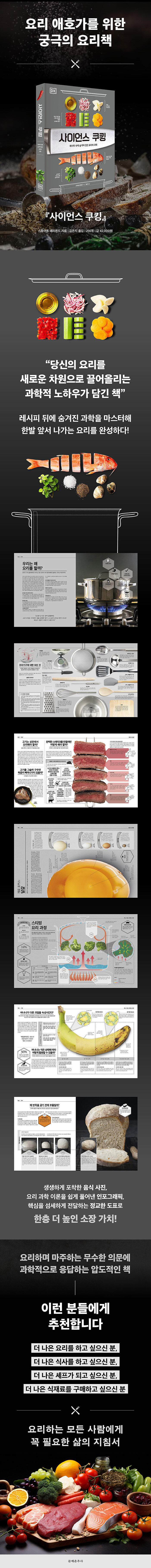 현미경으로 들여다본 달걀 거품의 변화, 화학 반응으로 설명되는 스테이크의 갈변, 허브를 넣는 타이밍에 따라 달라지는 향의 농도까지. 『사이언스 쿠킹』은 눈에 보이지 않던 변화를 보여주며 요리를 ‘실험’처럼 이해하게 만든다. 이 책의 목표는 단지 맛있는 요리를 완성하도록 돕는 데 그치지 않는다. 레시피의 굴레에서 벗어나 스스로 생각하고 응용하는 힘을 기르는 것, 그리고 요리를 새로운 시각으로 바라보게 하는 것이다. 『사이언스 쿠킹』은 요리를 사랑하는 모든 이들에게 ‘재현 가능한 실력’을 선물하는 책이다. 상상하지 못했던 즐겁고 새로운 방식의 요리가 여기서 시작된다.