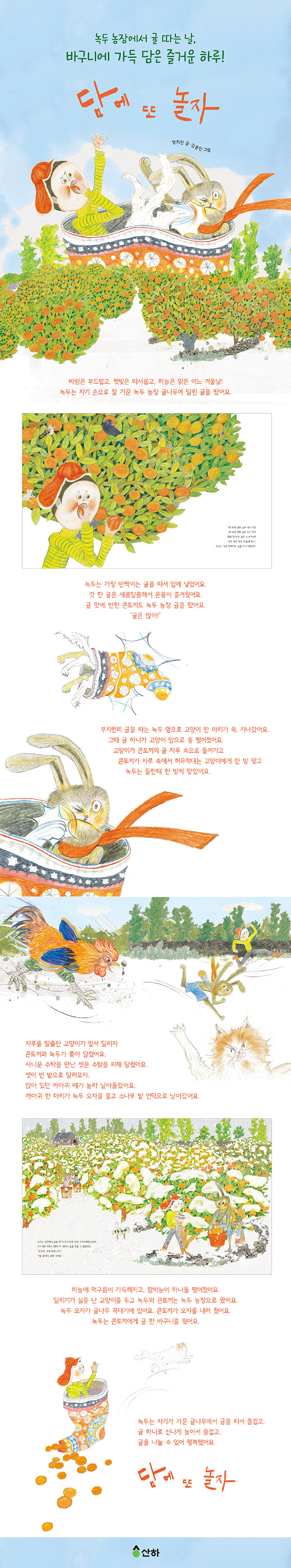 볼이 빨간 주인공 녹두가 눈빛을 빛내며 귤을 먹고 있어요. 하얀 털을 지닌 누군가는 뒷발로 토끼의 얼굴을 칩니다. 토끼는 아얏, 하는 표정입니다. 토끼의 주황색 목도리도 깜짝 놀란 듯 휘날리고 있어요. 잘 익은 주황색 귤이 가득한 귤밭에서 신나는 일이 있나 봐요.