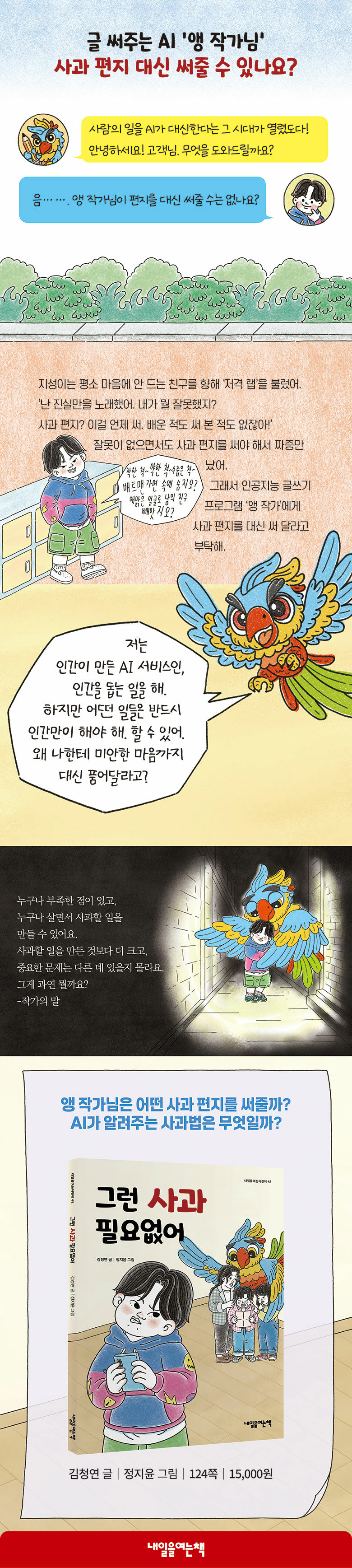 사과 편지를 AI 글쓰기 프로그램에 맡기면서 일어나는 에피소드가 흥미롭게 펼쳐진다. 지성이는 자신의 행동이 친구의 마음을 아프게 했다는 것을 알지 못하며, 사과 편지를 억지로 써야 하는 상황이 마음에 들지 않는다. 지성이는 자신의 진심을 담아야 하는 ‘사과 편지 쓰기’를 AI로 손쉽게 해결하려다 곤란해지지만, 다행히 AI ‘앵 작가’와 소통하며 해법을 찾아나가고 친구와도 화해에 이르게 된다.