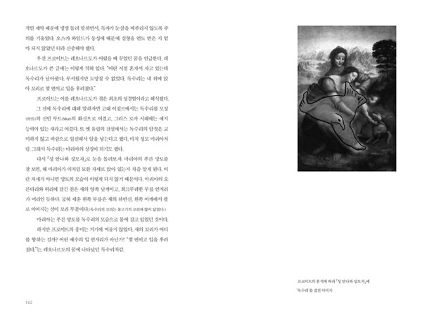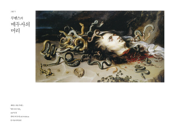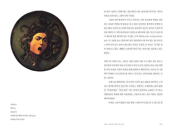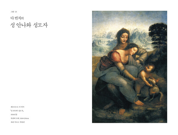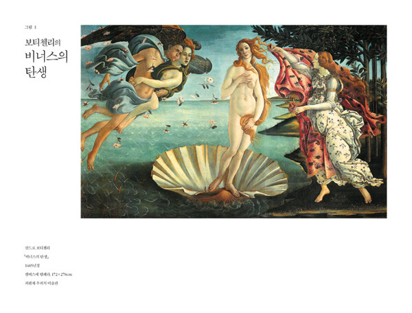 “보티첼리가 그린 비너스의 얼굴은 오른쪽 절반과 왼쪽 절반이 놀랄 정도로 다르다. 콧등 쪽에 거울을 놓고 양쪽을 번갈아 보면 알겠지만, 빛을 받아 밝은 오른쪽은 표정도 무구하고 사랑스럽다. 한편 그늘진 왼쪽은 마치 딴 사람처럼 침울하다. 사랑의 행복과 사랑의 깊은 죄가 하나의 얼굴에 공존하며 복잡하고 허무한 표정을 자아낸다.” ―본문 13쪽, 그림 1 보티첼리의 「비너스의 탄생」 중에서