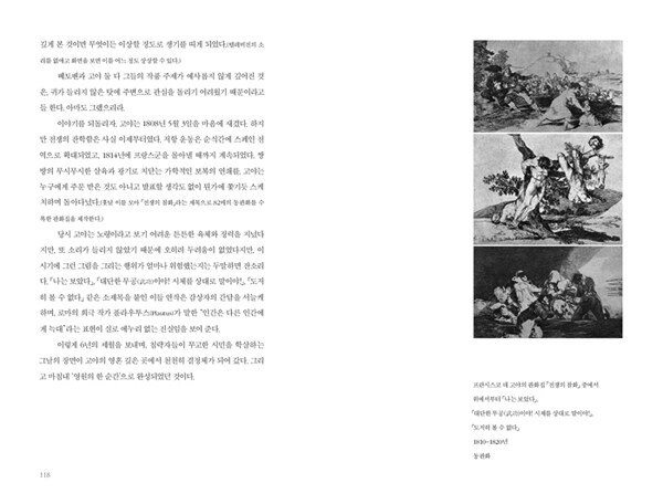 “참극은 끝났지만 그 흔적은 살육의 정황을 선명하게 보여 주었다. 마드리드에 사는 사람은 누구나 다음 날에 이를 보지 않을 수 없었다. 엄청난 수의 시체는 얼마간 방치되었고 피와 화약 냄새가 주위에 감돌았다. 포석에 들러붙은 검붉은 피는 지워지지 않았고, 총탄 자국은 가는 곳마다 검은 눈처럼 뚫려 있었으며, 찢어진 옷 조각과 피에 젖은 신발이 널려 있었다. 고야는 이 모든 것을 눈에 새겨 넣었다. 청력을 잃은 지 16년. 하나의 감각을 잃자 다른 감각의 보완 작용이 강해져 그는 보는 힘이 더욱더 예민해졌다.” ―본문 117쪽, 그림 11 고야의 「마드리드, 1808년, 5월 3일」 중에서