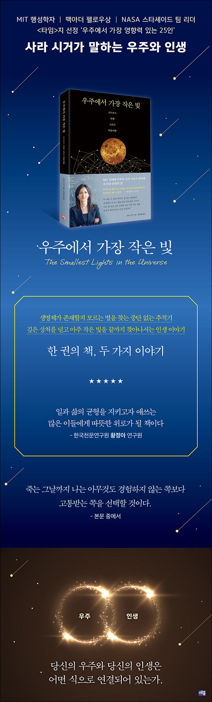 나도 내 사랑이 어디서 왔는지 기억한다. 말, 이성, 하키 같은 것이 아니라 왜 별이었을까? 그건 알 수 없다. 알 수가 없다. 어쩌면 별은 어둠의 정반대, 학대하는 양아버지와 위험에 빠진 여동생의 정반대이기 때문이었을지도 모른다. 별은 빛이다. 별은 가능성이다. 과학과 마법이 만나는 곳, 내가 사는 세상보다 더 큰 세상으로 난 창문이다. 별은 언젠가 나도 맞는 답을 찾을 수 있을 것이라는 희망을 줬다. (...) 별들은 내게 단순한 가능성이 아니라, 현실적인 확률을 의미했다. 지구상에서는 모든 것이 내게 불리하게만 보였다. 하지만 어디에 있느냐에 따라 모든 것이 달라질 수 있다. 별 하나하나를 다른 곳에 있을 수 있는 또 하나의 기회로 느꼈고, 지금도 그렇게 느낀다. 완전히 다른 새로운 곳 말이다.