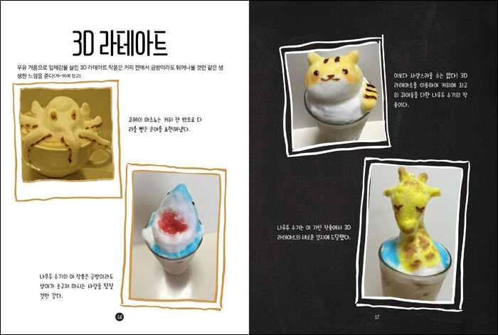 세계 바리스타 챔피언과 3D 라테아트의 개발자의 라테아트 테크닉.레시피 북. 일반적인 라테아트부터 우유 거품을 입체적으로 활용한 3D 라테아트를 만드는 방법과 스텐실?프리푸어링?에칭 등 다양한 라테아트 기법을 활용하는 방법이 소개되어 있다.